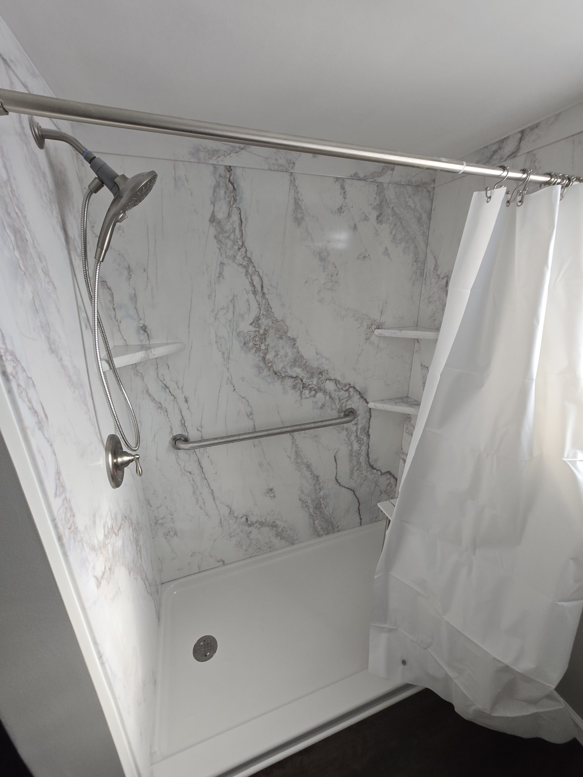 To create a safe and functional environment, we installed a walk-in Flex Stone shower surround and pan. The space was further enhanced with the addition of multiple grab bars and a fold-down seat to ease the homeowner’s daily life through the progression of his condition.